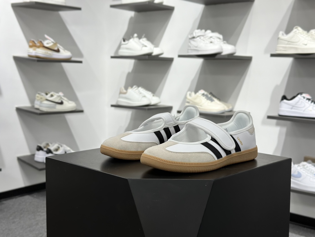 女鞋半码制#采用纤维牛剖革组合翻毛皮鞋面材质#内环保可再生海玻璃鞋垫#外置RB耐磨防滑橡胶大底带你回味最原始的永远经典,阿迪达斯/三叶草Adidas Originals OG Jane 桑巴舞玛丽珍系列复古魔术贴德训足球风百搭低帮休闲运动板鞋