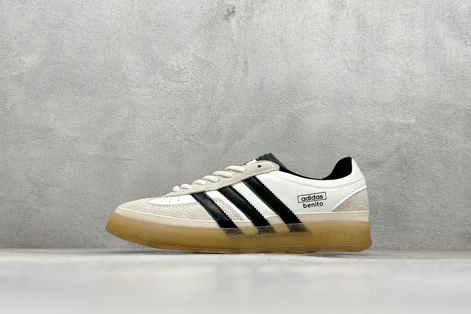 BadBunny本人在杂志拍摄时率先上脚带一波节奏,emm,手上拿的杂志封面还是Kylie,看来前女友和布克重新约会,这位哥也还是没放下啊…回到鞋款本身,整体选择了简约的黑白皮革搭配浅灰色长绒麂皮材质,最后以半透明生胶大底收尾,质感在线。不同于以往联名的调色盘操作,Bad Bunny对Gazelle indoor进行了加宽加厚处理,以及鞋头变形的设计,带来全新的歪头面包鞋型Gazelle。此外,鞋款标签直接呈现在后跟处,鞋侧adidas标识下方还加入了”benito”字样,辨识度拉满。
