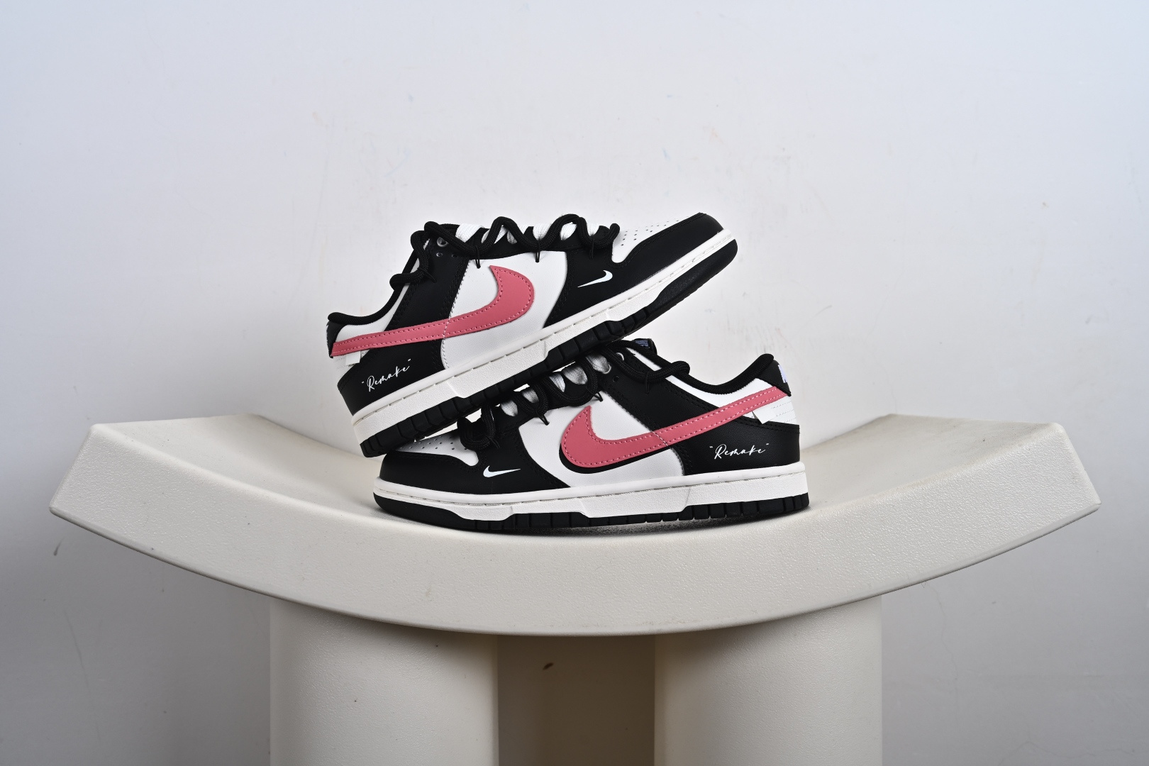 当极简黑白遇见悸动粉黛,经典轮廓化身甜酷宣言,一抹温柔粉黛跃上Swoosh,如黑莓丛中绽开的绯色浪漫,甜酷交织,瞬间点亮视觉焦点。侧身「Remake」铭刻叛逆诗意,让经典重生为专属你的风格符号。从晨间咖啡馆到霓虹夜街头,以脚步书写浪漫叙事,穿搭自显高级存在感。